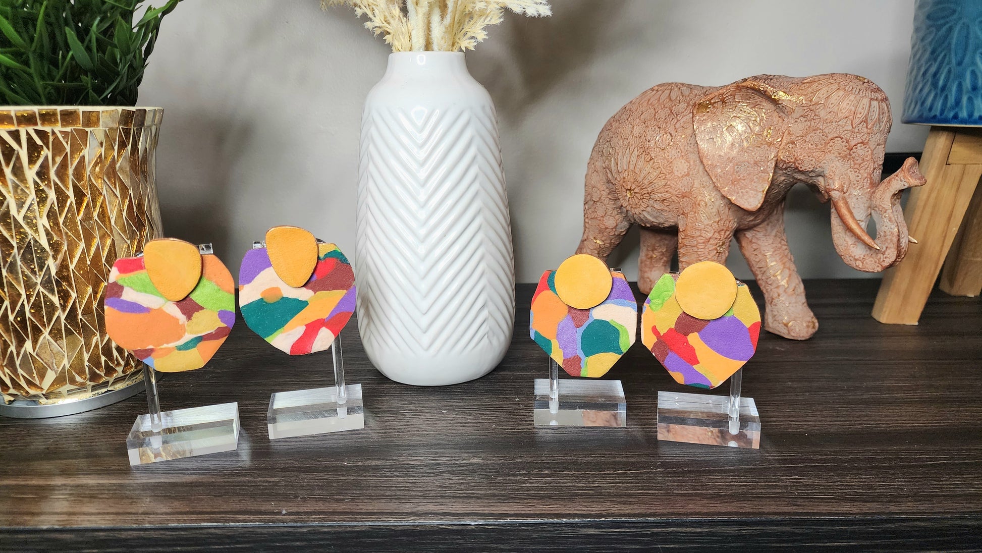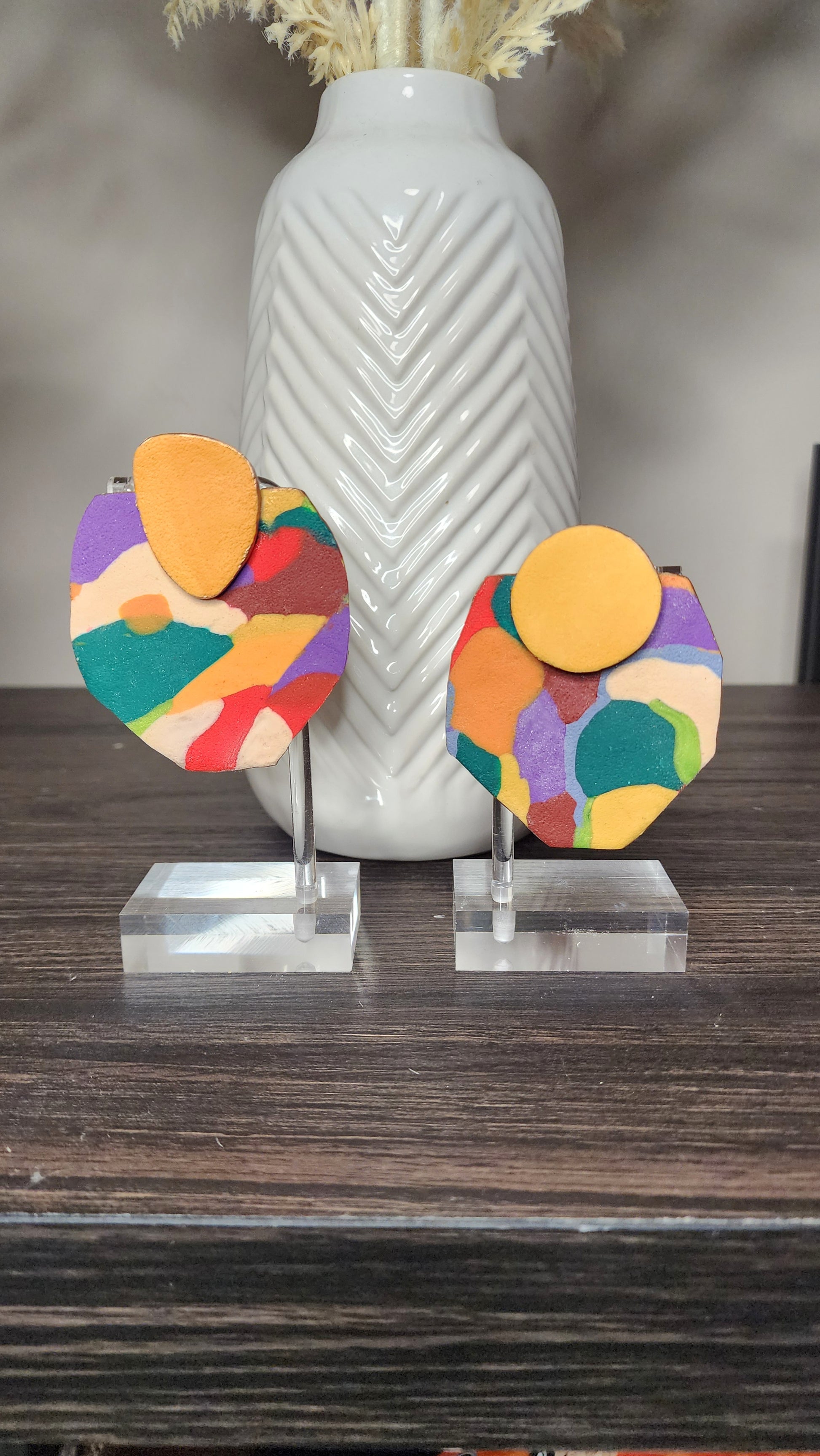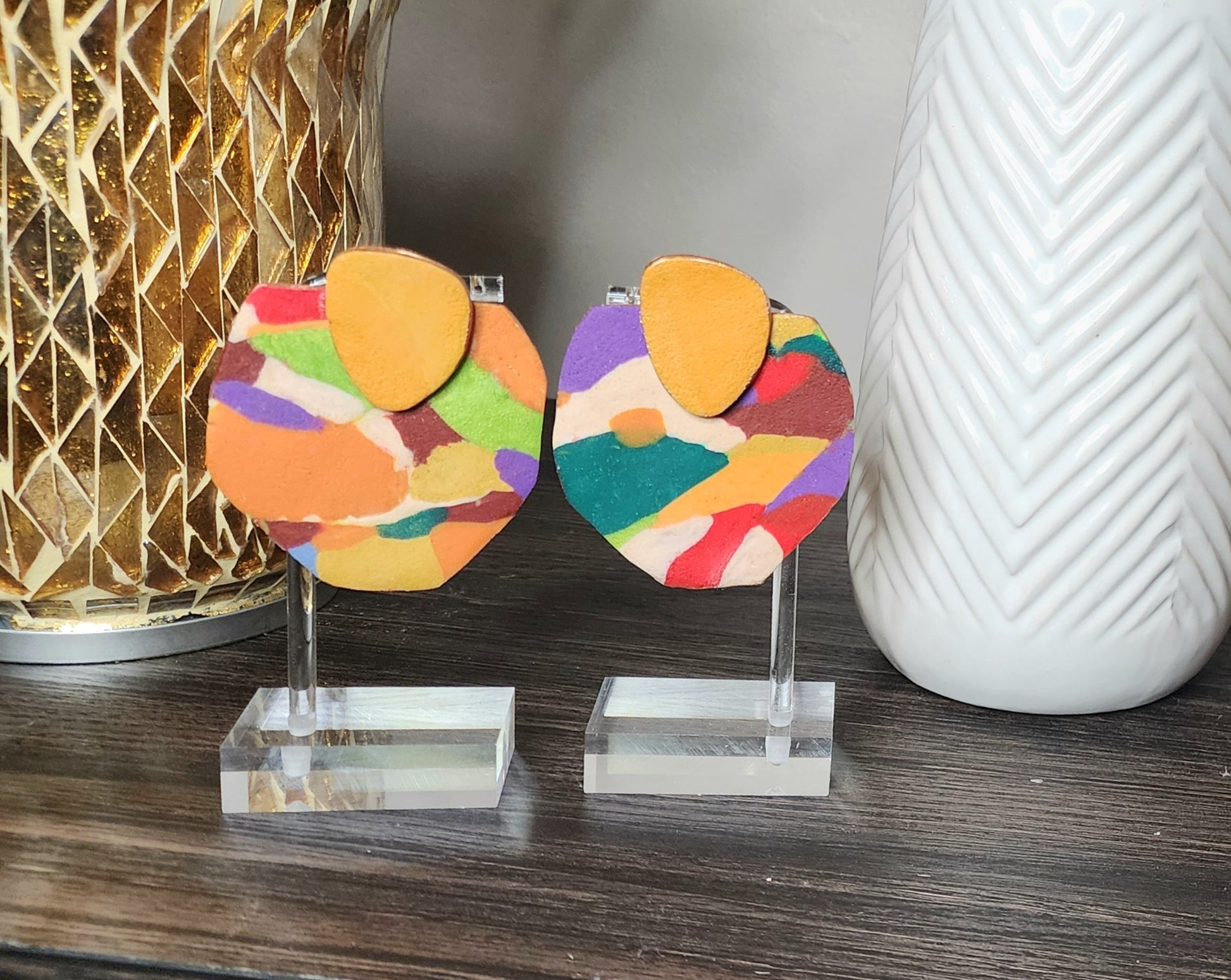 "The Visionary" earrings offer a matte colorful route to unique style. These 3x2.5 inch earrings are versatile for any occasion, making them a must-have accessory. Stand out with these statement pieces, perfect for adding a touch of flair to any outfit."
